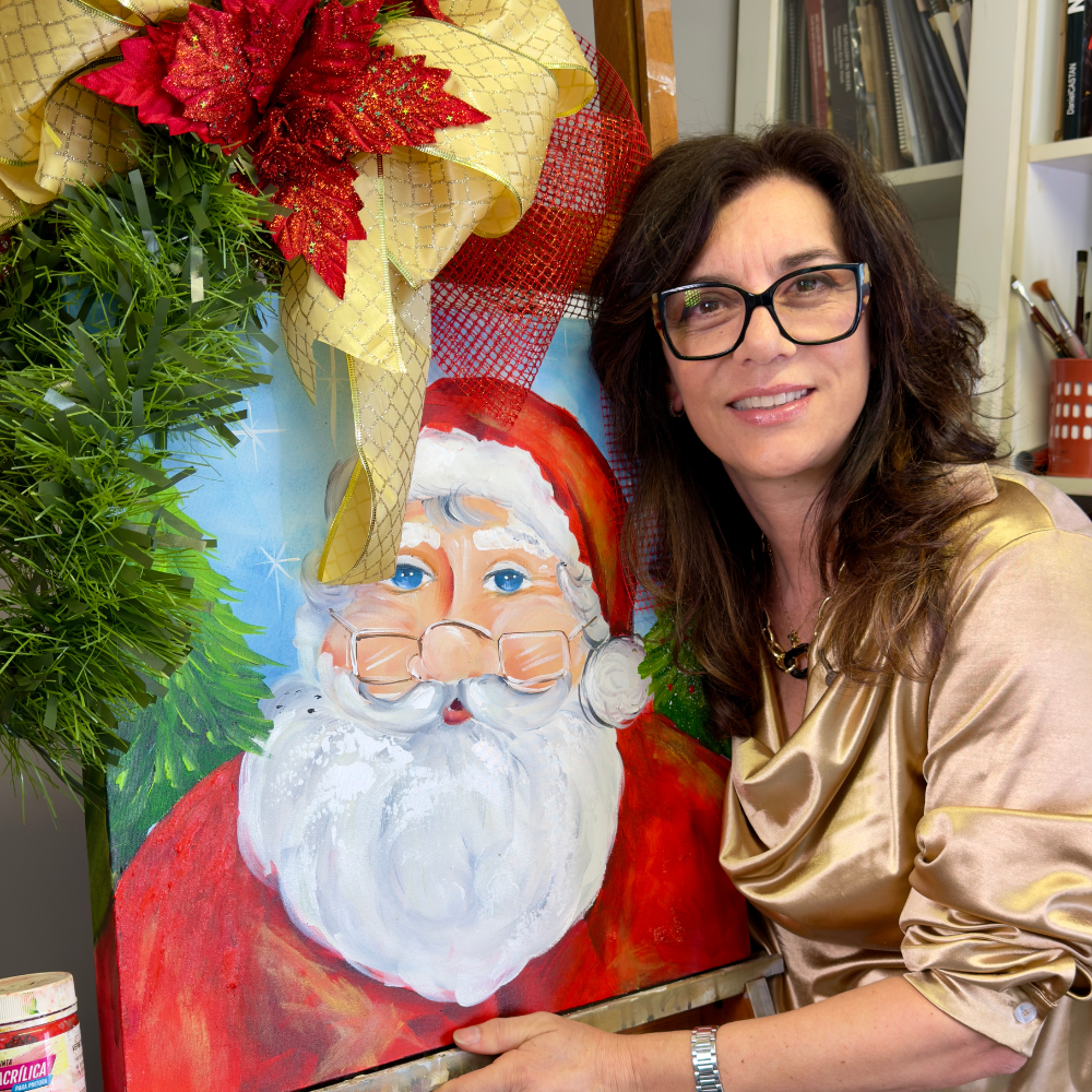 Você aprenderá a pintar um Papai Noel encantador, com luzes, volume e detalhes que trazem vida à sua obra — tudo do início ao fim.